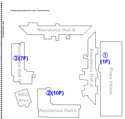 ①For Residence Hall A and B: Outside of Plaza Heisei elevator hall. A棟B棟に居住されている方はプラザ平成エレベーターホール外側の喫煙エリアをご利用ください。